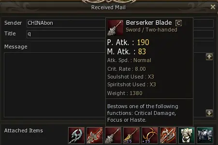 2 на прошлом старте сервера так и не ввели в продажу штамп для дуалов. Был только за 30 голды, а в замке оно стоит 0. Но в продаже на рынке я так его и не увидел. Если и продавали то за пару лямов, что выводит стоимость B сосок сильно вверх. Повторяю свое предложение- добавить штамп в магазин (за адену или АА) по более адекватной цене.
